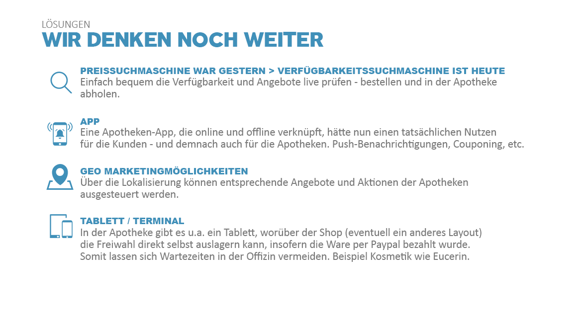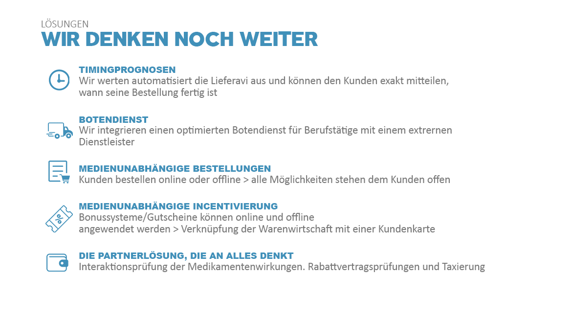 Insellösungen sind von gestern. Daher haben wir das Thema Click & Collect zum Überthema schlecht hin gemacht. Und das bedeutet, dass wir eine Lösung entwickelt haben, die in Ihre Prozesse in der Offizin, vollständig integriert ist. Dafür haben wir Anbindungen in mehreren Bereichen geschaffen, die die "Onlinebestellung" direkt in Ihr Kassensystem führt. Lassen Sie sich beraten und wir zeigen Ihnen die intelligenten Lösungen für Ihre Apotheke.