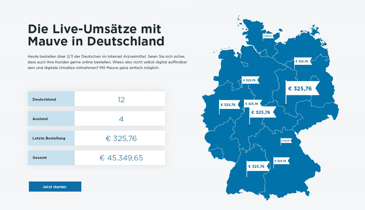 Mit der „An-alles-gedacht-Lösung“ von Mauve ist Ihre Apotheke blitzschnell im Netz. Steigern Sie Ihren Offizin-Umsatz in der digitalen Welt und senken Ihre Transaktionskosten in der Apotheke durch den automatischen Bestands.- und Preisabgleich. Parallel dazu werden die Aufträge direkt an Ihr Apothekensystem übermittelt. Bieten auch Sie Ihren Kunden eine echte Alternative zu den großen Onlineapotheken. Denn Sie sind viel schneller. Wo starten wir gemeinsam?