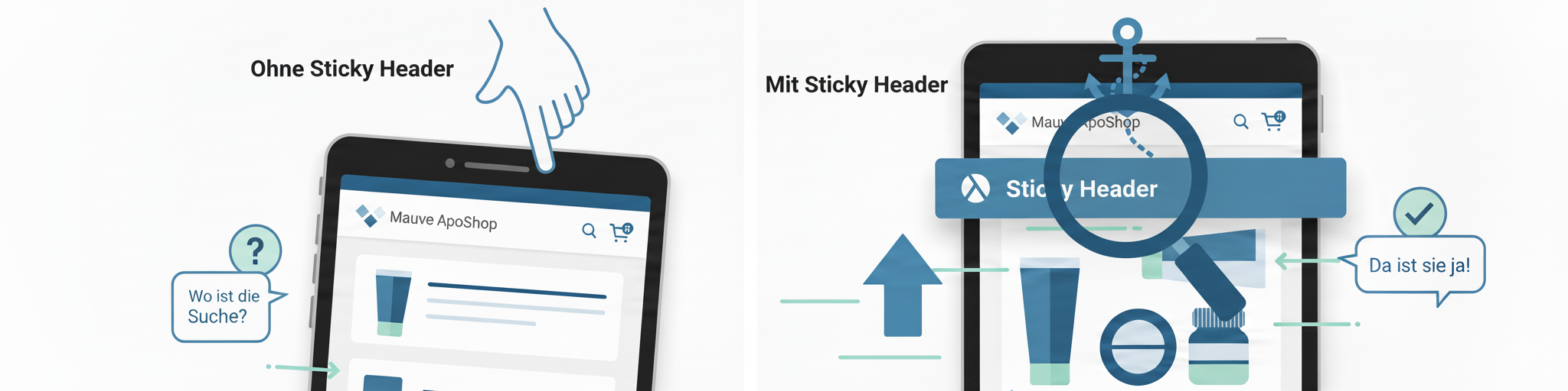 Was ist ein Sticky Header? Stellen Sie sich vor, Sie scrollen durch eine Produktseite Ihres Shops. Normalerweise verschwinden dabei wichtige Navigationselemente wie die Suche oder der Warenkorb aus dem Blickfeld. Mit dem Sticky Header gehört das der Vergangenheit an! Er bleibt beim Scrollen immer am oberen Bildschirmrand sichtbar – für maximale Bequemlichkeit.