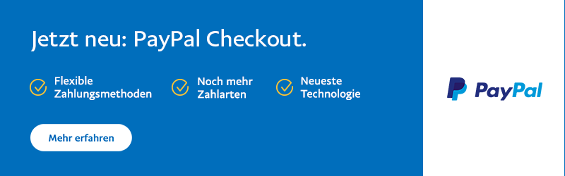 Ab sofort bietet PayPal den neuen PayPal Checkout an. Mit nur einer Integration können Sie Ihr Geschäft vereinfachen und gleichzeitig Ihre Umsatzchancen steigern. So bietet der PayPal Checkout alle gängigen nationalen Zahlarten sowie auch viele im Ausland beliebte lokale Zahlmethoden. Zudem können Sie mithilfe dynamischer Banner früher im Kaufprozess auf flexible Finanzierungsoptionen aufmerksam machen und von zukunftssicherer Technologie sowie modernen Verkäuferschutz- und Betrugsschutzsystemen profitieren.