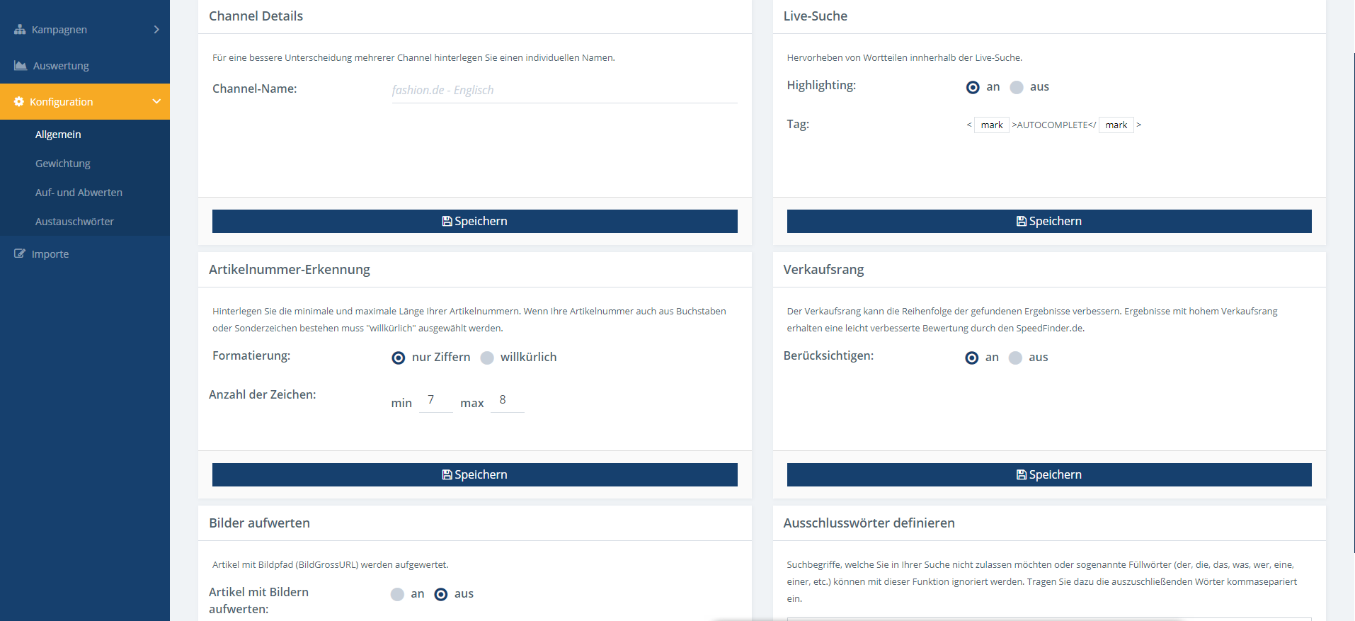 Im ebenfalls neu gestalteten Backend des SpeedFinders gibt ein übersichtliches Dashbord Auskunft über die wichtigsten Kennzahlen des SpeedFinders wie Suchanfragen und Top-Suchanfragen der letzten 7 Tage sowie beispielsweise Anzahl der Kampagnen, Artikel, den letzten Import und das Optimierungspotenzial. Detaillierte Informationen und umfangreiche Einstellungsmöglichkeiten verbergen sich hinter den Reitern Kampagne, Auswertung und Konfiguration in der linken Navigationsleiste.