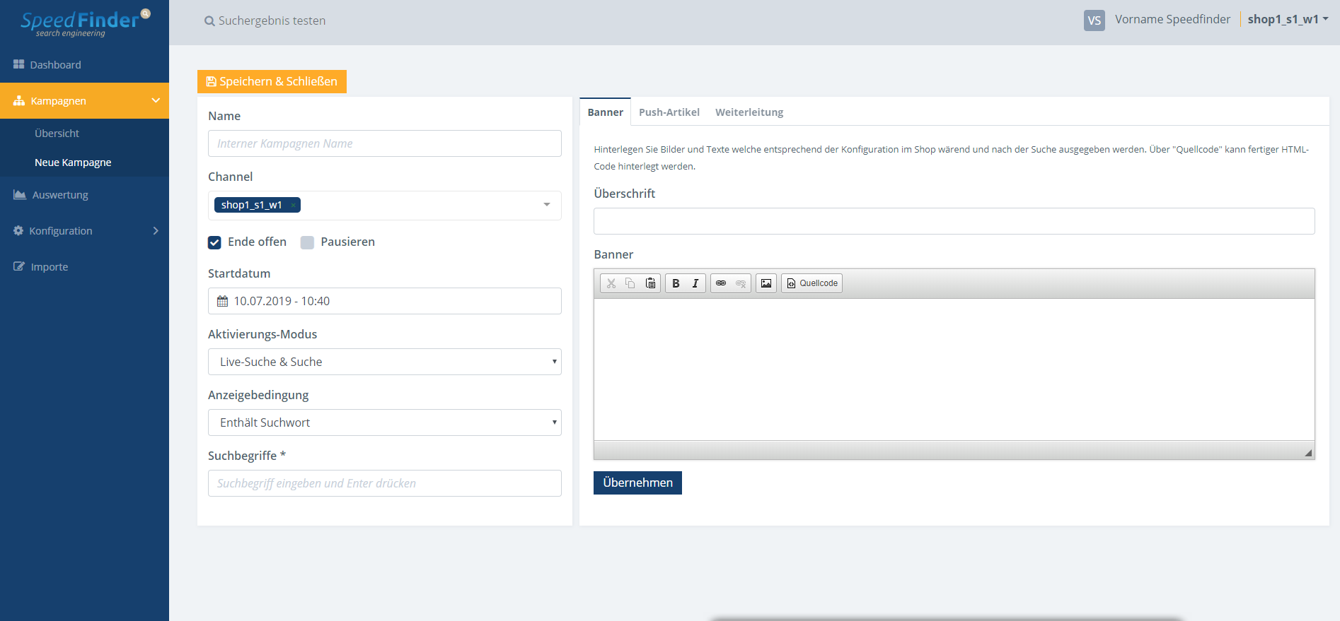 Über die Kampagnen-Einstellungen können die Suchergebnisse beeinflusst werden. Abhängig vom Suchbegriff können Endkunden auf eine andere Seite weitergeleitet, ausgewählte Produkte prominent platziert oder zusätzliche Informationen im Suchergebnis platziert werden. Für die Auswertung lässt sich ein Zeitraum auswählen. Zudem kann die Auswertung nur auf "Suchbegriffe mit Ähnlichkeitssuche" oder nur auf "Suchbegriffe ohne Ergebnis" beschränkt werden.