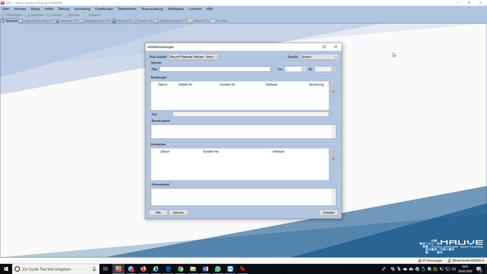 Nach der Einrichtung und Gestaltung von M-Produktbewertung im Webshop können die Bewertungen und Kommentare, sobald ein Benutzer die erste Bewertung abgegeben hat, im Mauve System3 unter Shopverwaltung / Artikelbewertungen verwaltet werden.